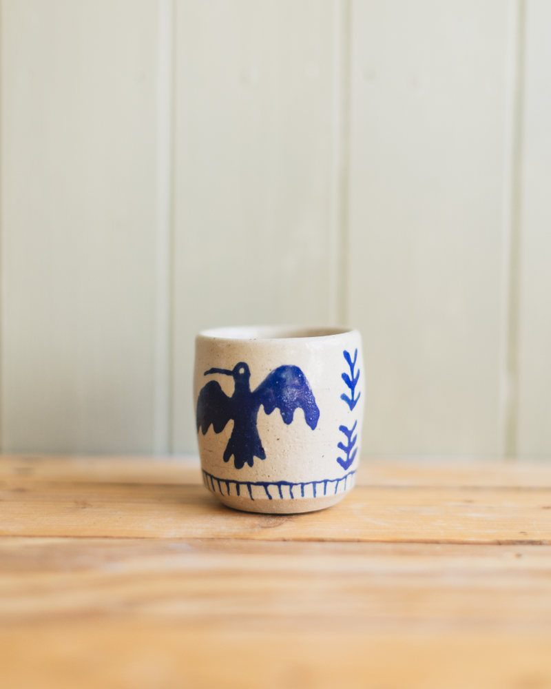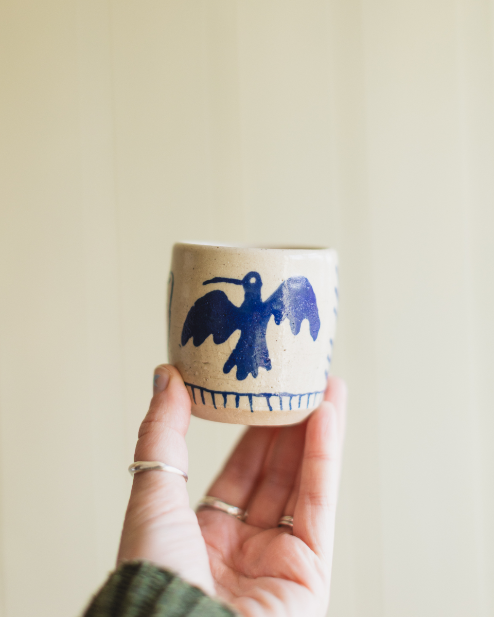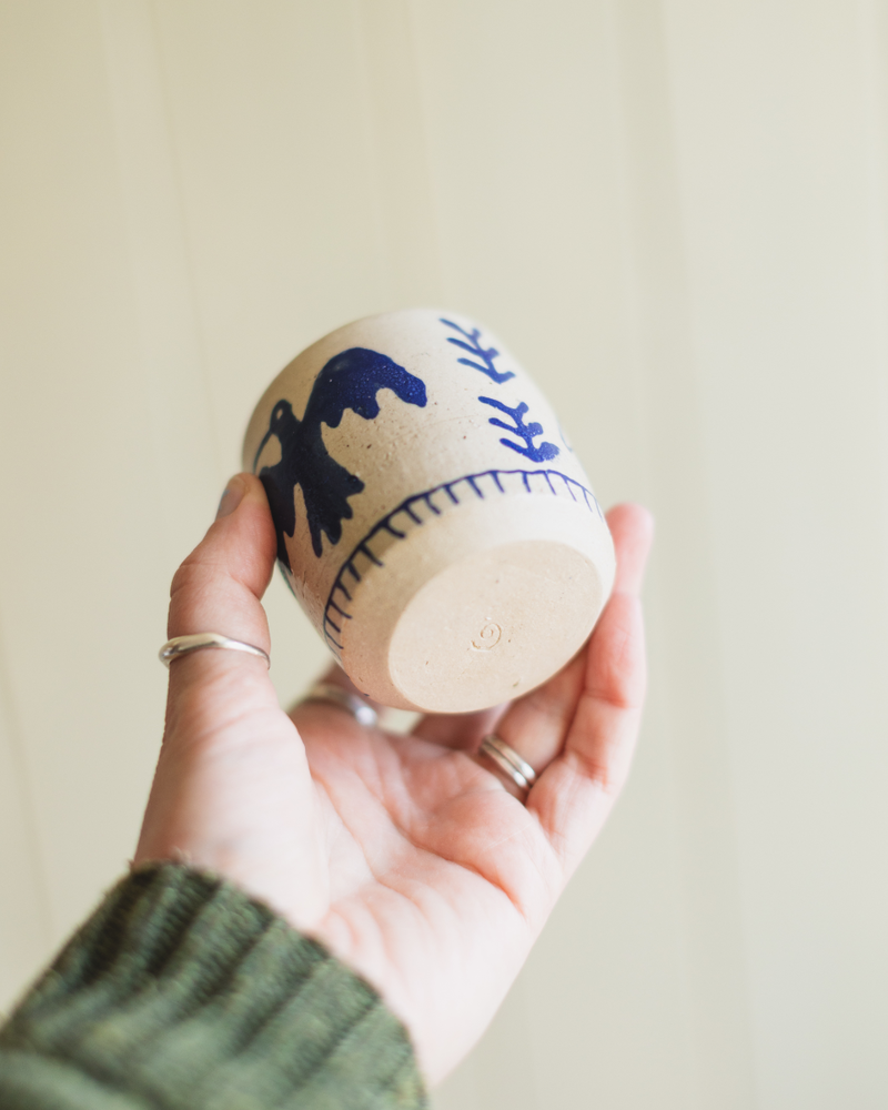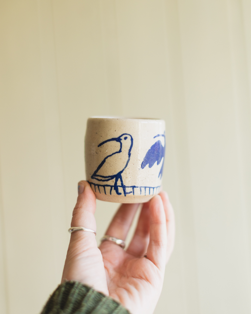 Trio of hand illustrated curlews in cobalt. Made from Cornish stoneware clay.