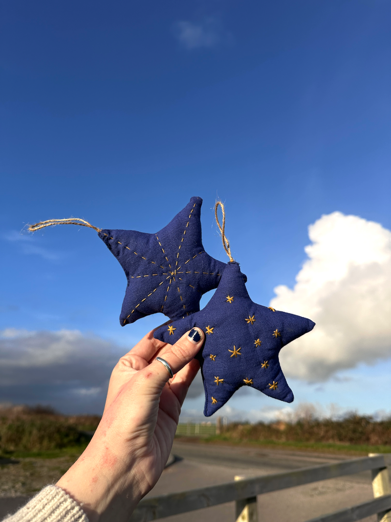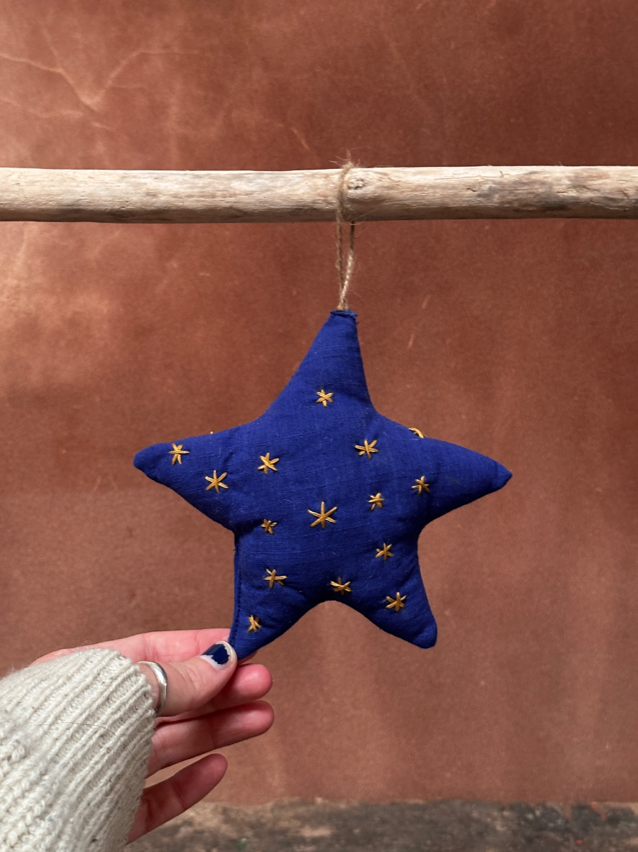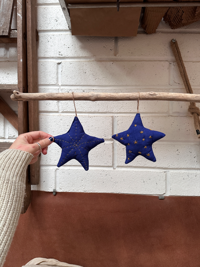Handmade indigo linen stars filled with repurposed wool fleece, decorated with hand embroidery and sashiko thread.