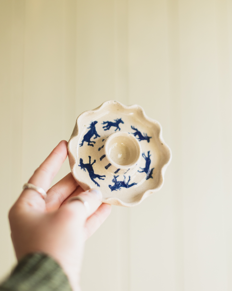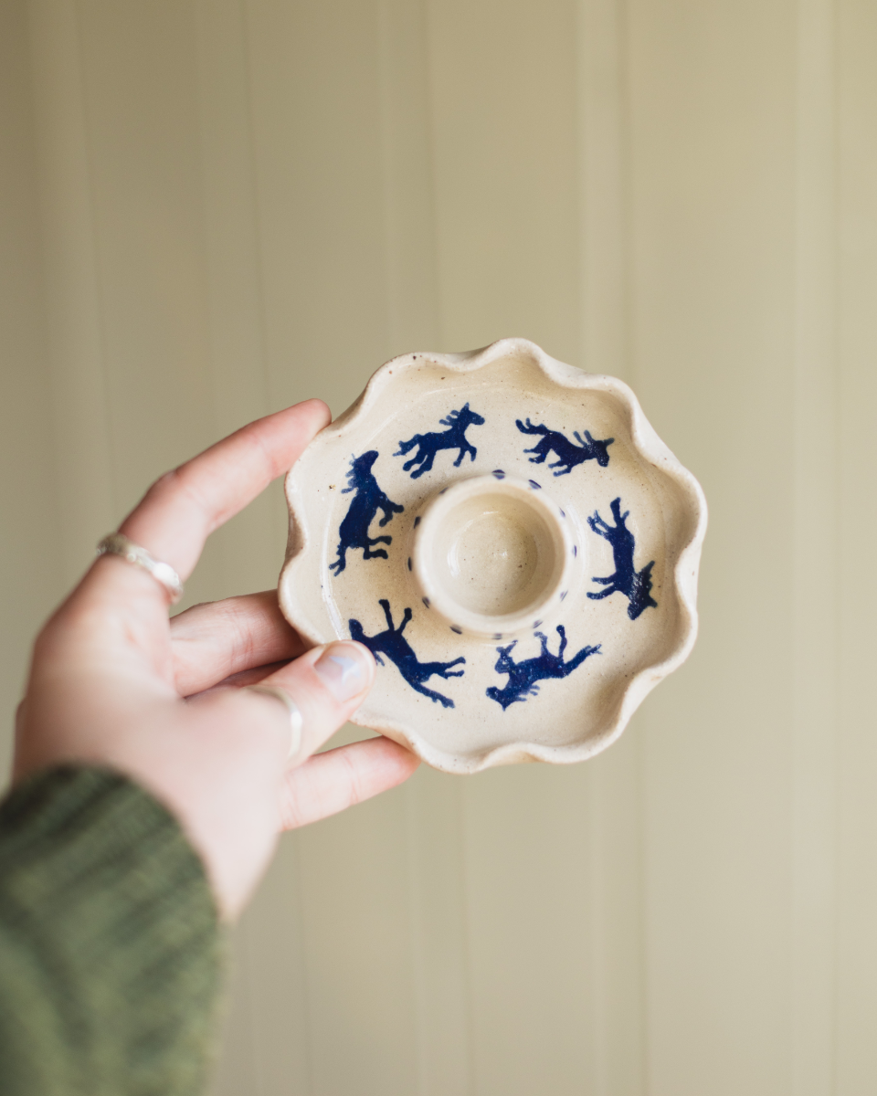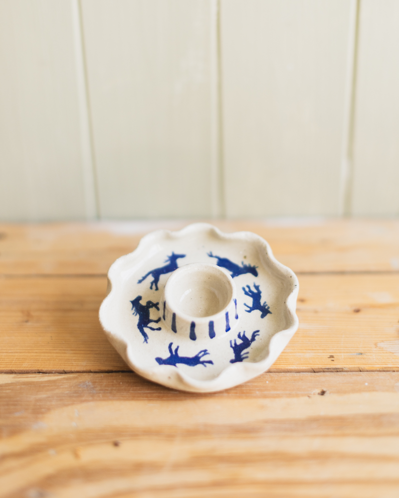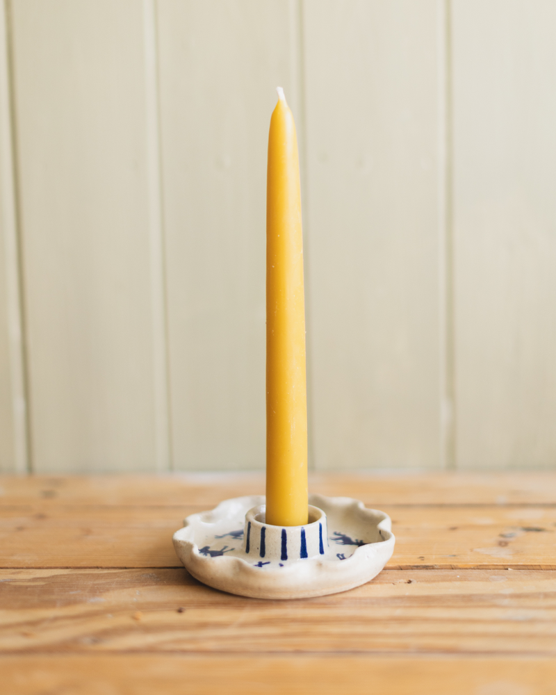 Cornish stoneware clay ceramic candle stick holder. Hand illustrated