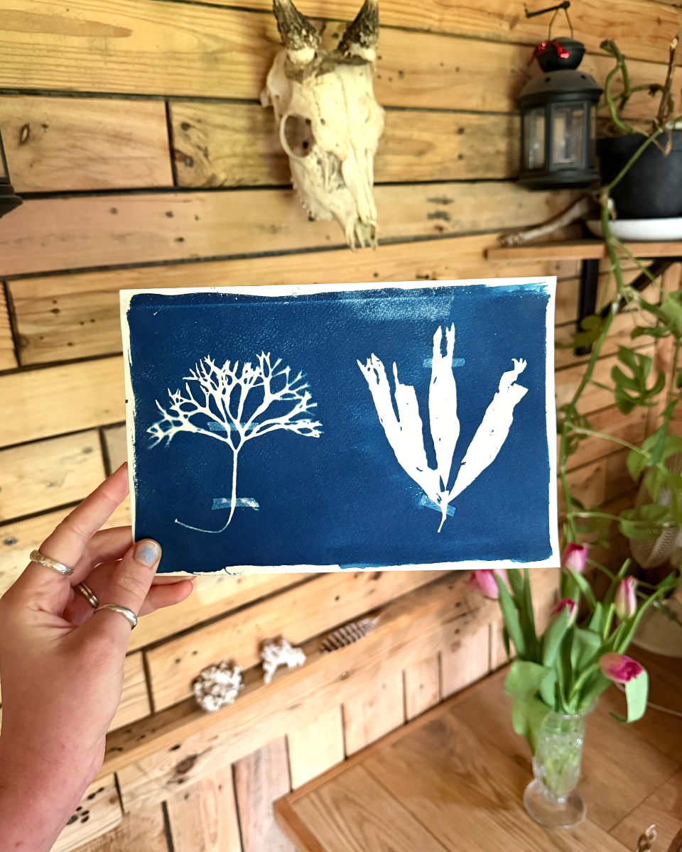 The cyanotype process is a 19th century, iron based, photographic printing method in which negatives are used to expose light onto paper- creating these iconic Prussian blue prints.
