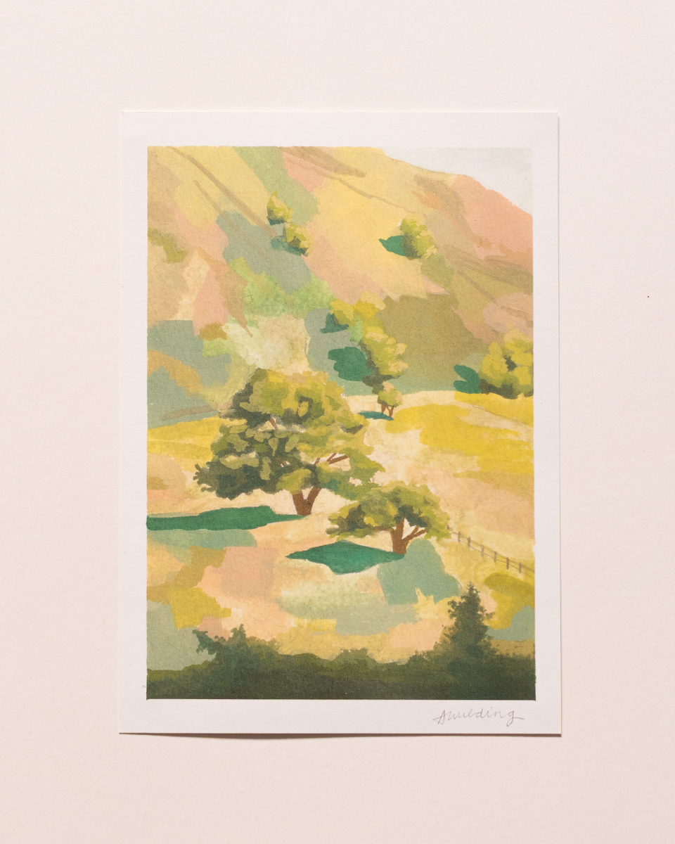 Gouache painting of hillside trees.